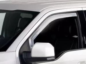 These in-channel design side window deflectors allow you to keep out the elements while letting fresh air in. Precision fit- rugged ABS construction. Chrome finish complements OE trim. Kits available for all cab styles with standard style mirrors (Kits for trucks with trailer tow mirrors available soon). Side Window Air Deflectors Regular Cab, Chrome.
